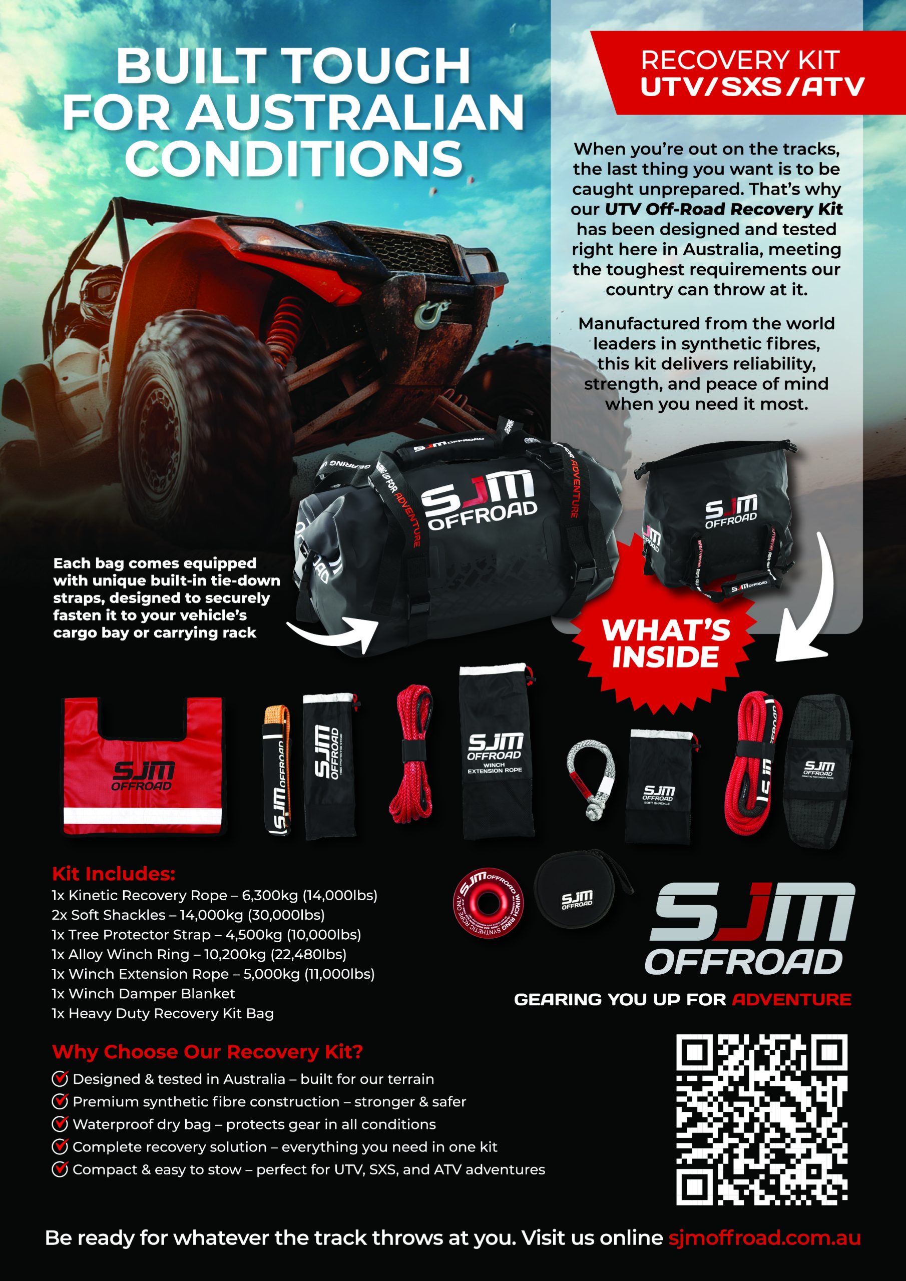 When you’re out on the tracks, the last thing you want is to be caught unprepared. That’s why our UTV Off-Road Recovery Kit has been designed and tested right here in Australia, meeting the toughest requirements our country can throw at it.